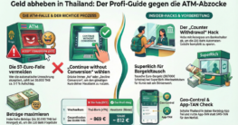 🚀 Das Wichtigste in Kürze (Expert Edition) Die Kostenfalle: Neben der Fixgebühr (220-250 Baht) lauert eine versteckte Wechselkursgebühr von bis zu 7%. Der ATM-Trick: Wähle immer „Continue without Conversion“ (meistens links/rot!). Der „Counter Hack“: Geld am Bankschalter mit Pass abheben kostet oft 0 Baht Gebühr. Hardware Tipp: Krungsri (Gelb) gibt bis 30.000 THB. AEON Automaten […]