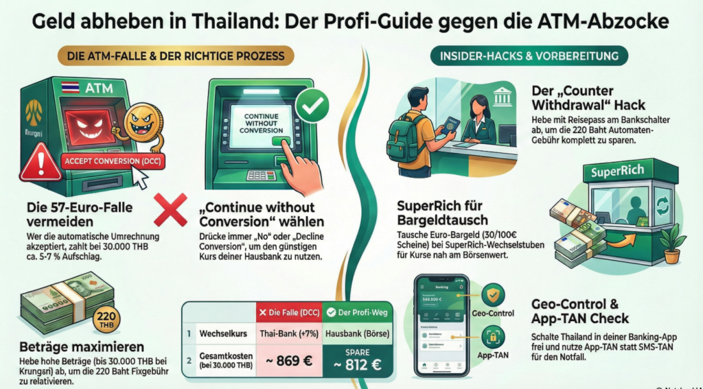 - Die Kostenfalle: Neben der Fixgebühr (220-250 Baht) lauert eine versteckte Wechselkursgebühr von bis zu 7%.